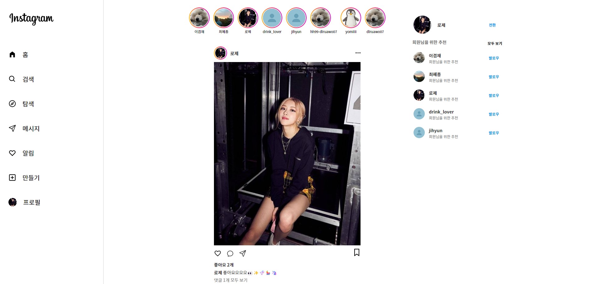 클론 코딩 프로젝트 백엔드 Spring 4분과 프론트 React 2명, 총 6명이서 진행하였고 인스타그램 PC버을 클론 코딩하였다. 결과물은 다음과 같다.