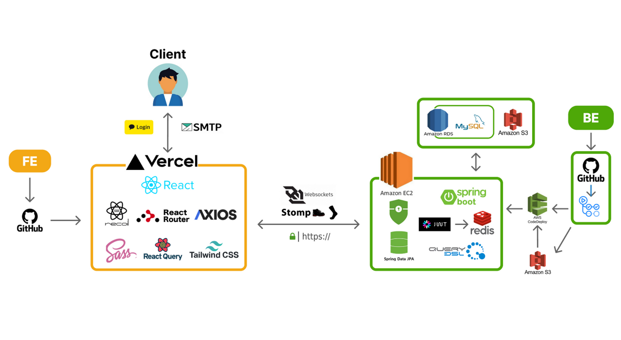다른 팀들의 아키텍처 설계 이미지와 비교해 보니 우리 팀의 아키텍처 설계가 조금 난잡하다는 생각이 들었다. 굳이 필요하지 않은 기능 스택은 제외하고 좀 더 가독성이 좋고 연관관계가 잘 나타나도록 팀원들과 수정해 보았다.