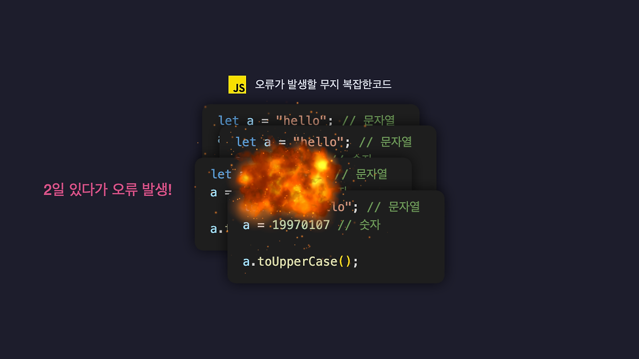 자바스크립트는 동적 타입 시스템으로, 개발자의 타입 실수 시 즉시 실행이 중단되지 않기 때문에 언젠가 예상치 못한 치명적인 문제가 발생할 가능성이 높다!