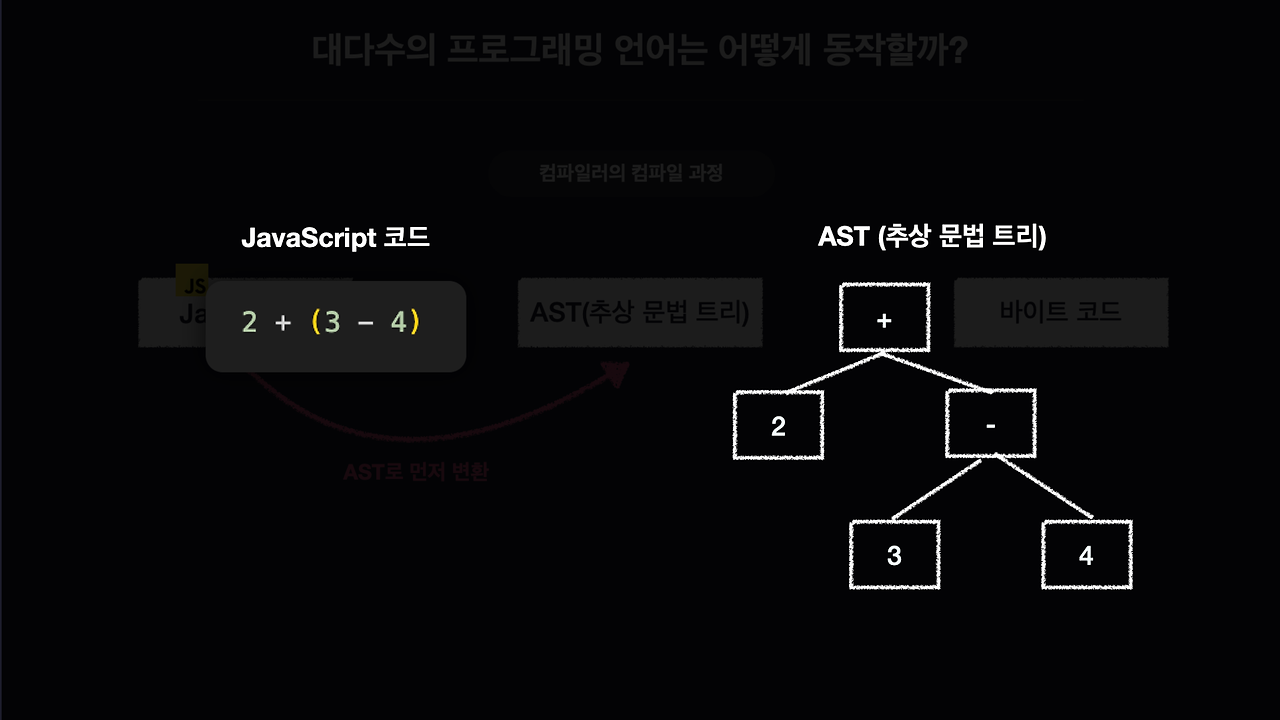 - 프로그래밍 언어 -> AST 추상 문법 트리 -> 바이트 코드
