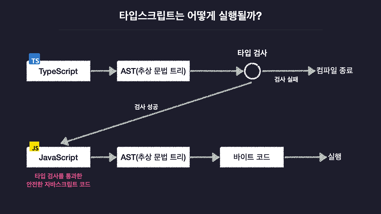 타입스크립트 코드 -> AST 추상 문법 트리 변환 -> 타입 검사(실패시 컴파일 종료) -> 자바스크립트 언어로 변환