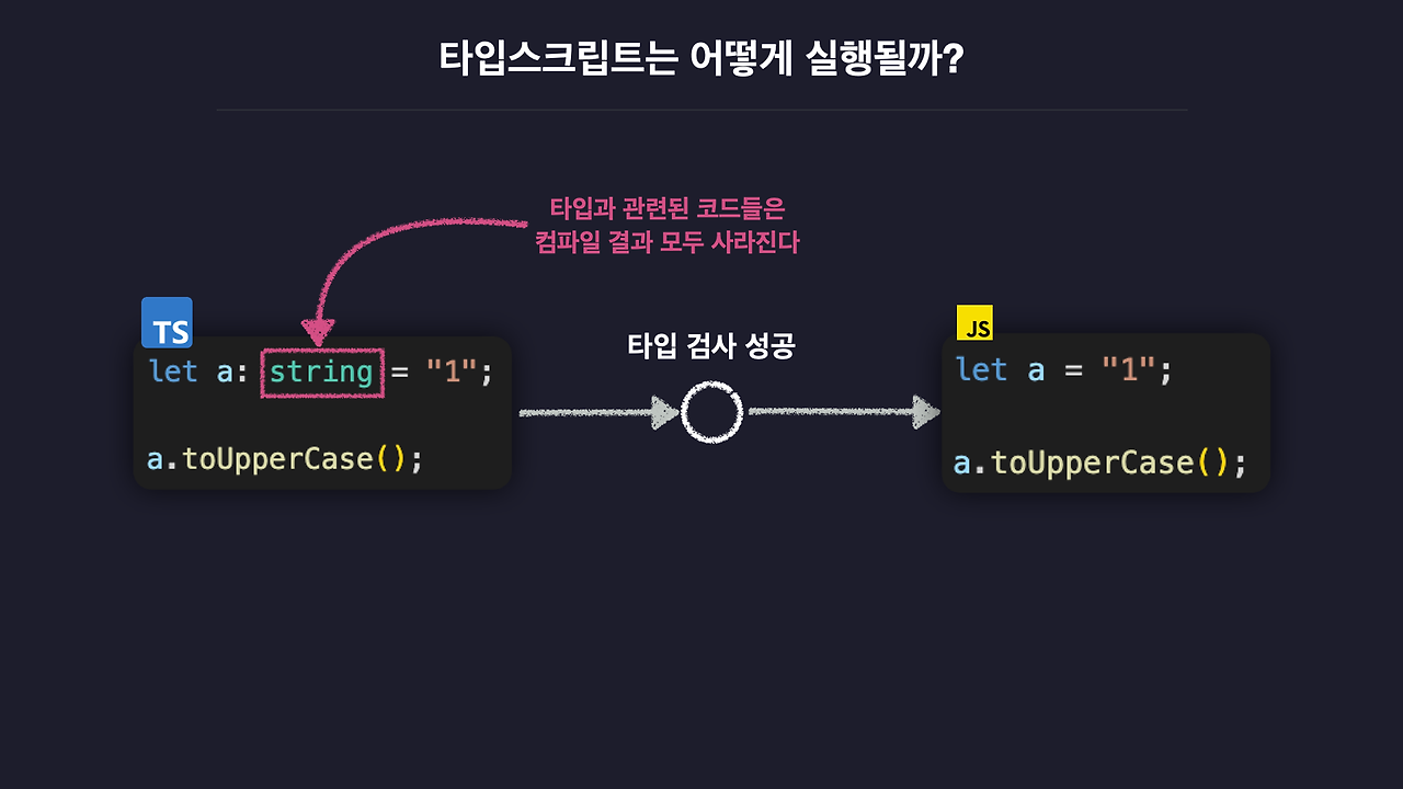 만약 타입 오류가 없는 정상적인 코드라면 타입 검사 성공 -> AST를 바이트코드가 아닌, ‘자바스크립트 코드’로 변환하고 컴파일이 종료된다.
