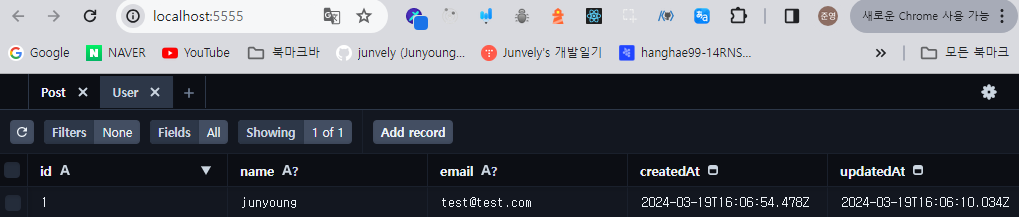 방금 업데이트한(Prisma Studio에서 )따끈따끈한 user 데이터를 확인할 수 있었다.....❗
