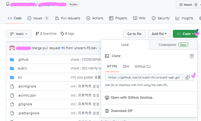 해당 repo에서 우측 Code버튼을 클릭하면 클론 가능한 깃헙 주소를 복사한 후, 터미널에서 git clone명령어와 함께 url부분에 추가한다.