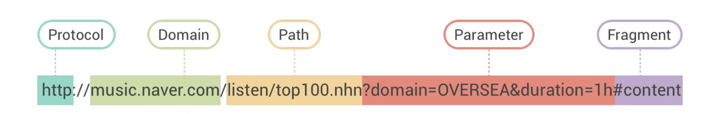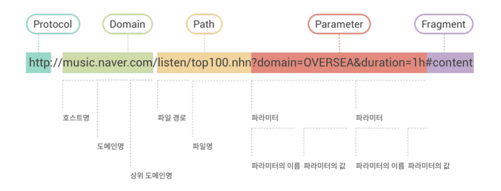 URL은 보통 http또는 https와 같은 Protocol, 호스트명, 도메인명 상위 도메인명으로 이루어진 Domain, Path, Parameter, Fragment로 이루어져 있다.
