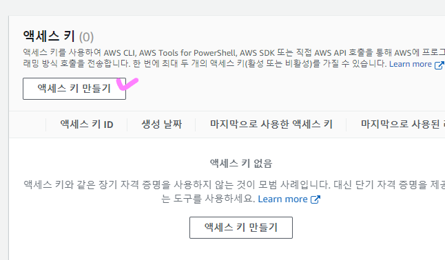 2. 액세스 키 만들기 클릭 => 키 생성 => 액세스 키와 비밀 액세스 키 메모장에 적어놓기(루트사용자는..경고뜸)