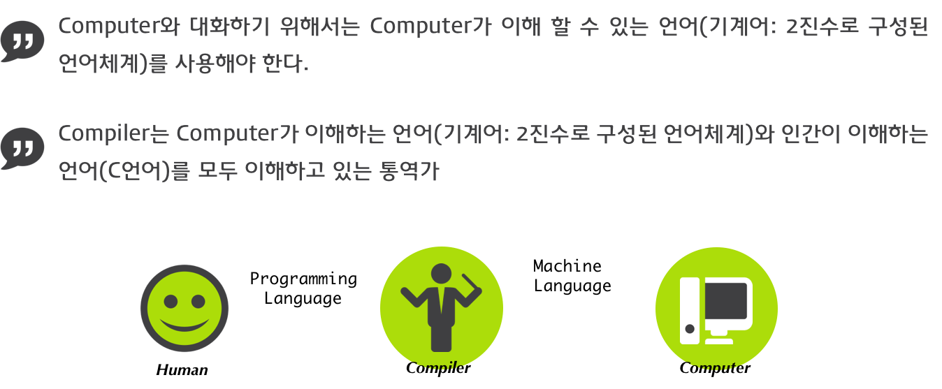 인간이 이해할 수 있는 약속된 구문(Syntax, 문법)으로 구성된 “프로그래밍 언어(Programming Language)”를 사용하여 프로그램을 작성한 후, 그것을 컴퓨터가 이해할 수 있는 기계어로 변환하여 주는 일종의 번역기를 이용한다. 이 일종의 번역기를 컴파일러(compiler) 혹은 인터프리터(interpreter)라고 한다.