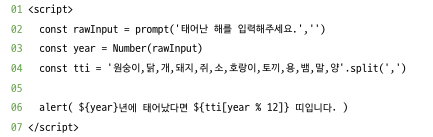 alert(`${year}년에 태어났다면 ${result} 띠입니다.`);