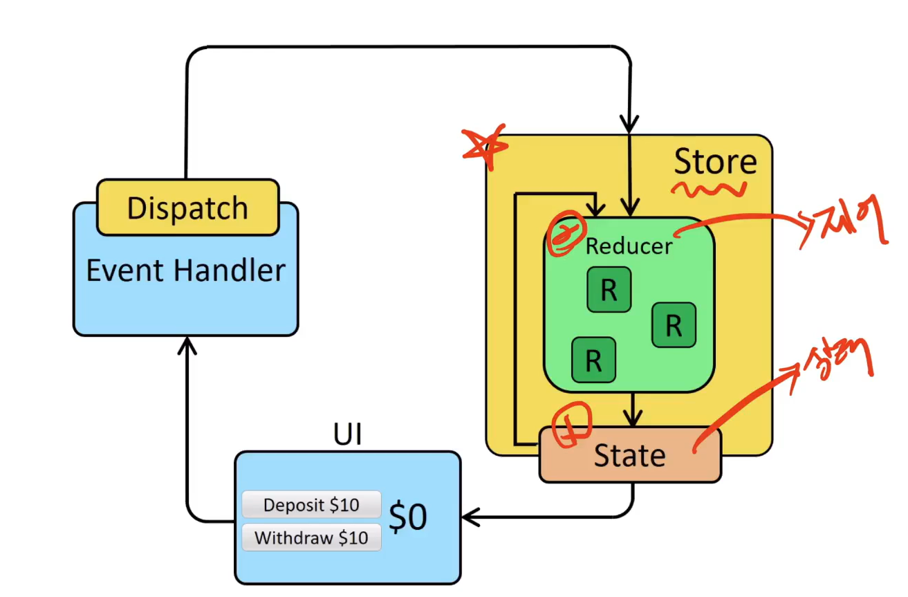 event 발생 => dispatch실행(action전달) => store에 action 전달